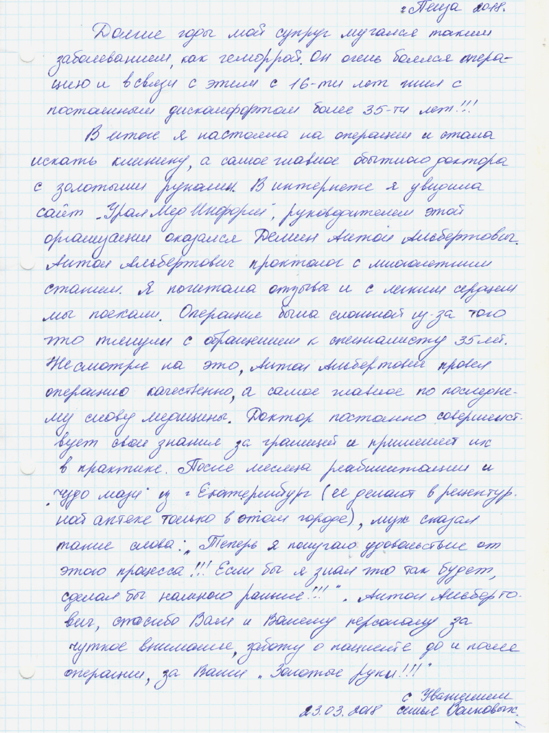 КомментарийЯ рекомендую всем Людмилу Владимировну. Она не только профессионал своего дела, но и очень приятный в общении человек. Ее забота и внимание к моим проблемам сделали мое лечение более комфортным и эффективным.
